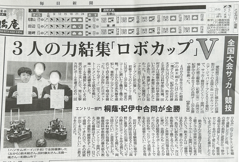 ロボカップ全国大会エントリー部門優勝 和歌山ビッグ愛教室でロボティクスプロフェッサーコースに通ってくださっている鈴木あまね君が仲良し3人組で、先日開催されたロボカップのエントリー部門に出場、和歌山大会を優勝し、全国大会に進み見事に優勝されました。 この様に記事を掲載すると、我が教室で素晴らしい指導をしている様に見えますが、残念ながら我が教室の力ではなく、ひとえにご本人たちの努力とご指導いただいているクラブの顧問の先生の力です。 本当におめでとうございました。 今回は世界大会には進めないエントリーコースでの出場でしたが、次回は世界大会に進めるコースでチャレンジするそうです。 凄い! 頑張れ!